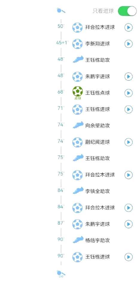 第74分钟,蒯纪闻与向余望撞墙配合后禁区线抽射建功,6-0!1分钟后,王钰栋助攻拜合拉木推射破门,7-0!第84分钟,李镇全角球进攻突破下底,拜合拉木门前抢点完成帽子戏法,8-0!第87分钟,拜合拉木门前接王钰栋传中被扑,朱鹏宇补射破门,9-0!比赛最后阶段,王钰栋在禁区外围调整后轰出世界波,10-0!小栋成功上演帽子戏法,打出一场完美的比赛,堪称一战封神!